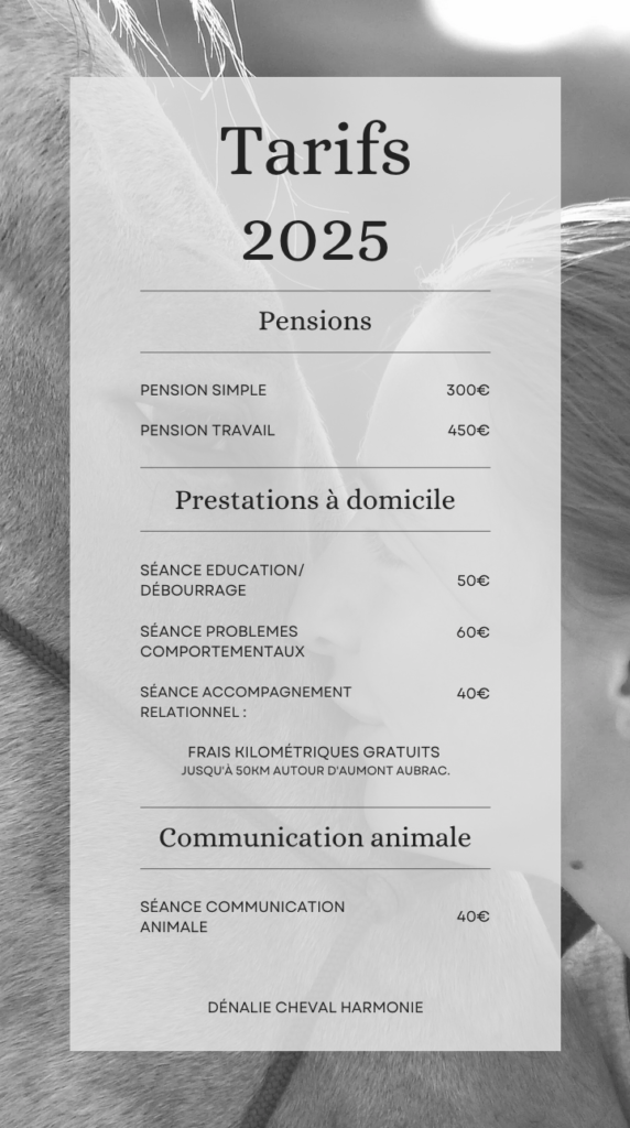 Tarifs Dénalie cheval harmonie Chaque prestation est adaptée aux besoins spécifiques de votre cheval et de votre relation avec lui.Vous trouverez ici les détails des tarifs pour chaque service proposé. N’hésitez pas à me contacter pour toute question ou demande personnalisée.